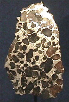 Meteorites are traditionally classified as irons, stones, and stony-irons. The stony-irons, mixtures of metallic iron and stone, are much rarer than the other types. The samples below are on display at the Smithsonian Museum of Natural History.