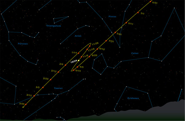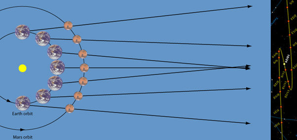 Retrograde Motion of MarsArising from the nature of the orbits of Earth and Mars around the Sun, there are times when Mars appears to be traveling backward for a short time compared to the "fixed stars". Below are NASA/JPL-Caltech illustrations from http://mars.jpl.nasa.gov/allabout/nightsky/nightsky04.html Looking up in the sky each night at the same time, you would usually observe that Mars is a little further east each night compared to the constellations. But about every two years there are a couple of months when Mars appears to move from east to west when observed at the same time (retrograde motion). The above is the pattern as observed in 2003. ![]() This is the apparent path of Mars during 2005 when it exhibited retrograde motion over about a two month period. ![]() This backward or retrograde motion was mysterious to the early observers, and led to the use of the word "planet", from the Greek term which means "wanderer". With our current understanding that the Earth travels around the Sun in 1 year while the more distant Mars has a siderial period of 1.88 Earth years, it is clear that the Earth will periodically "catch up" to its more distant neighbor. As the Earth moves forward in its orbit, Mars will appear to slip backward compared to its more common eastward march across the sky. ![]() From one time that the Earth and Mars are on a line through the Sun (called being in "opposition") to the next opposition is 2.135 Earth orbits. It is in a short period including the time of opposition when Mars exhibits its retrograde motion to an observer on the Earth. The time period between oppositions is called the synodic period. |