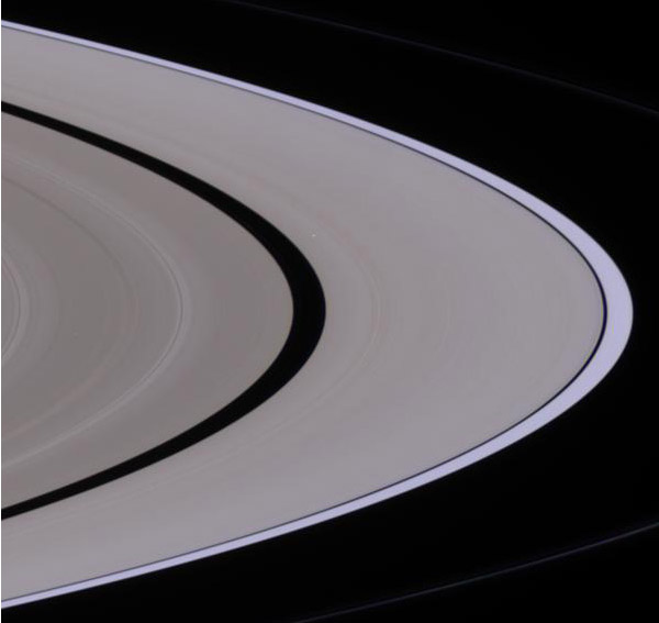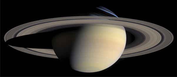 Saturn Images from CassiniThe voyage of the Cassini spacecraft has yielded an abundance of information about Saturn and its moons. These are some of the detailed images of Saturn and its ring system taken on the Cassini mission. For more information about the Cassini-Huygens mission visit http://saturn.jpl.nasa.gov/home/index.cfm. The Cassini imaging team homepage is at http://ciclops.org. The images and descriptions here are taken from the NASA websites. ![]() While cruising around Saturn in early October 2004, Cassini captured a series of images that have been composed into the largest, most detailed, global natural color view of Saturn and its rings ever made. This grand mosaic consists of 126 images acquired in a tile-like fashion, covering one end of Saturn's rings to the other and the entire planet in between. The images were taken over the course of two hours on Oct. 6, 2004, while Cassini was approximately 6.3 million kilometers (3.9 million miles) from Saturn. Since the view seen by Cassini during this time changed very little, no re-projection or alteration of any of the images was necessary. Three images (red, green and blue) were taken of each of 42 locations, or "footprints," across the planet. The full color footprints were put together to produce a mosaic that is 8,888 pixels across and 4,544 pixels tall. The smallest features seen here are 38 kilometers (24 miles) across. Many of Saturn's splendid features noted previously in single frames taken by Cassini are visible in this one detailed, all-encompassing view: subtle color variations across the rings, the thread-like F ring, ring shadows cast against the blue northern hemisphere, the planet's shadow making its way across the rings to the left, and blue-grey storms in Saturn's southern hemisphere to the right. Tiny Mimas and even smaller Janus are both faintly visible at the lower left. The Sun-Saturn-Cassini, or phase, angle at the time was 72 degrees; hence, the partial illumination of Saturn in this portrait. Later in the mission, when the spacecraft's trajectory takes it far from Saturn and also into the direction of the Sun, Cassini will be able to look back and view Saturn and its rings in a more fully-illuminated geometry. Image Credit: NASA/JPL/Space Science Institute ![]() Saturn's sunlit rings gleam in the blackness as two icy moons cruise past in the foreground. Enceladus (505 kilometers, or 314 miles across) is a small crescent near upper left; Janus (181 kilometers, or 113 miles across) is a speck above the F ring, near center. Janus was brightened slightly for visibility. This view looks toward the lit side of the rings from about 5 degrees below the ringplane. This image was taken in visible red light with the Cassini spacecraft wide-angle camera on Nov. 7, 2006, at a distance of approximately 1.1 million kilometers (700,000 miles) from Saturn and at a sun-Saturn-spacecraft, or phase, angle of 139 degrees. Image scale on the sky at the distance of Saturn is 63 kilometers (39 miles) per pixel. This view is from Cassini's vantage point beneath the ring plane. The rings are tilted away from Cassini at an angle of about 4 degrees. Images taken using red, green and blue spectral filters were used to create this natural color mosaic. The images were acquired using the Cassini spacecraft narrow angle camera on Dec. 12, 2004, at a distance of approximately 1.8 million kilometers (1.1 million miles). ![]() ![]() ![]() ![]() The best view of Saturn's rings in the ultraviolet indicates there is more ice toward the outer part of the rings, than in the inner part, hinting at the origins of the rings and their evolution. Images taken during the Cassini spacecraft's orbital insertion on June 30 show compositional variation in the A, B and C rings. From the inside out, the "Cassini Division" in faint red at left is followed by the A ring in its entirety. The Cassini Division at left contains thinner, dirtier rings than the turquoise A ring, indicating a more icy composition. The red band roughly three-fourths of the way outward in the A ring is known as the Encke gap. The ring system begins from the inside out with the D, C, B and A rings followed by the F, G and E rings. The red in the image indicates sparser ringlets likely made of "dirty," and possibly smaller, particles than in the icier turquoise ringlets. This image was taken with the Ultraviolet Imaging Spectrograph instrument, which is capable of resolving the rings to show features up to 97 kilometers (60 miles) across, roughly 100 times the resolution of ultraviolet data obtained by the Voyager 2 spacecraft. The Cassini-Huygens mission is a cooperative project of NASA, the European Space Agency and the Italian Space Agency. The Jet Propulsion Laboratory, a division of the California Institute of Technology in Pasadena, manages the mission for NASA's Science Mission Directorate, Washington, D.C. The Cassini orbiter and its two onboard cameras were designed, developed and assembled at JPL. The imaging operations center is based at the Space Science Institute in Boulder, Colo. | Index Solar System Illustration Solar System Concepts | ||||||