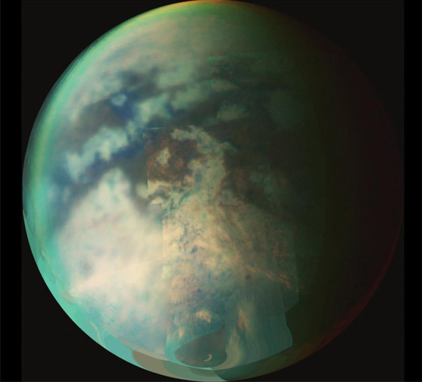 This image of Titan is a composite of several images taken during two separate Titan flybys on Oct. 9, 2006 (T19) and Oct. 25 (T20).