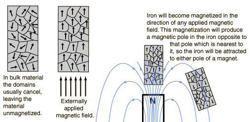 FerromagnetismIron, nickel, cobalt and some of the rare earths (gadolinium, dysprosium) exhibit a unique magnetic behavior which is called ferromagnetism because iron (ferrum in Latin) is the most common and most dramatic example. Samarium and neodymium in alloys with cobalt have been used to fabricate very strong rare-earth magnets. Ferromagnetic materials exhibit a long-range ordering phenomenon at the atomic level which causes the unpaired electron spins to line up parallel with each other in a region called a domain. Within the domain, the magnetic field is intense, but in a bulk sample the material will usually be unmagnetized because the many domains will themselves be randomly oriented with respect to one another. Ferromagnetism manifests itself in the fact that a small externally imposed magnetic field, say from a solenoid, can cause the magnetic domains to line up with each other and the material is said to be magnetized. The driving magnetic field will then be increased by a large factor which is usually expressed as a relative permeability for the material. There are many practical applications of ferromagnetic materials, such as the electromagnet. Ferromagnets will tend to stay magnetized to some extent after being subjected to an external magnetic field. This tendency to "remember their magnetic history" is called hysteresis. The fraction of the saturation magnetization which is retained when the driving field is removed is called the remanence of the material, and is an important factor in permanent magnets. All ferromagnets have a maximum temperature where the ferromagnetic property disappears as a result of thermal agitation. This temperature is called the Curie temperature. Ferromagntic materials will respond mechanically to an impressed magnetic field, changing length slightly in the direction of the applied field. This property, called magnetostriction, leads to the familiar hum of transformers as they respond mechanically to 60 Hz AC voltages.