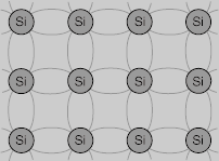 Silicon atoms form covalent bonds and can crystallize into a regular lattice. The illustration below is a simplified sketch; the actual crystal structure of silicon is a diamond lattice. This crystal is called an intrinsic semiconductor and can conduct a small amount of current.