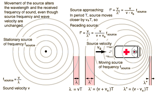 Doppler EffectWhen a vehicle with a siren passes you, a noticeable drop in the pitch of the sound of the siren will be observed as the vehicle passes. This is an example of the Doppler effect. An approaching source moves closer during period of the sound wave so the effective wavelength is shortened, giving a higher pitch since the velocity of the wave is unchanged. Similarly the pitch of a receding sound source will be lowered.