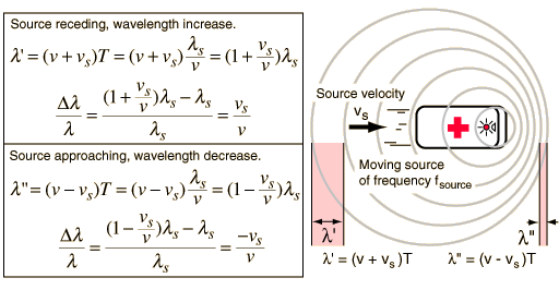 Doppler Wavelength ChangeThe speed of sound is determined by the medium in which it is traveling, and therefore is the same for a moving source. But the frequency and wavelength are changed. The wavelengths for a moving source are given by the relationships below. It is sometimes convenient to express the change in wavelength as a fraction of the source wavelength for a stationary source: ![]()