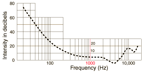 Threshold of HearingThe measured threshold of hearing curve shows that the sound intensity required to be heard is quite different for different frequencies. The standard threshold of hearing at 1000 Hz is nominally taken to be 0 dB, but the actual curves show the measured threshold at 1000 Hz to be about 4 dB. There is marked discrimination against low frequencies so that about 60 dB is required to be heard at 30 Hz. The maximum sensitivity at about 3500 to 4000 Hz is related to the resonance of the auditory canal. ![]()