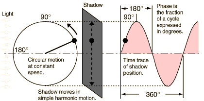 PhaseIf a mass on a rod is rotated at constant speed and the resulting circular path illuminated from the edge, its shadow will trace out simple harmonic motion. If the shadow vertical position is traced as a function of time, it will trace out a sine wave. A full period of the sine wave will correspond to a complete circle or 360 degrees. The idea of phase follows this parallel, with any fraction of a period related to the corresponding fraction of a circle in degrees. ![]() |