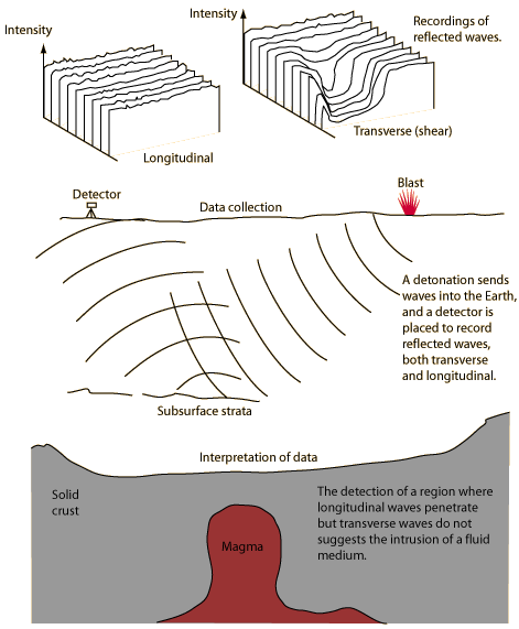 Geologic Example: Longitudinal and Transverse WavesLongitudinal waves can propagate through either solid or fluid media, but transverse or "shear" waves cannot propagate in a fluid. This can be used to advantage in geological studies as depicted in the illustration below. ![]() Since the longitudinal waves travel through both solid and liquid, the longitudinal data can be used as a reference for mapping the transverse wave data. Collecting seismic data from both longitudinal waves and transverse waves and taking the difference allows the experimenters to map the underground liquified region. Both types of waves in the material of the Earth are known as seismic waves. The longitudinal waves are called P waves and the transverse waves S waves. P waves typically travel almost twice as fast as S waves. When ground movement like that recorded in the Mammoth Lakes region of California is discovered, then this kind of study can give some idea about the intrusion of magma underneath the surface. |
