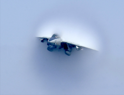F-14 Tomcat Fighter Aircraft in Transonic FlightMilitary aircraft routinely accelerate to speeds greater than the local sound speed. Historically, this was referred to as "breaking the sound barrier". The passage from subsonic to supersonic speeds is accompanied by some unusual phenomena which lie in the realm of "nonlinear" mechanical events - events involving some degree of chaos. A fascinating accompaniment to transonic flight is a suddenly appearing vapor cloud surrounding the aircraft. The F-14 Tomcat is one aircraft for which there are numerous photographs and videos like the one below of the vapor phenomenon. ![]() Photo credit:Photographer's Mate Airman Justin S. Osborne, Navy NewsStand --Eye on the Fleet Photo Gallery ( http://www.news.navy.mil/view_photos.asp , 030422-N-0382O-588). This video of an F-14 in transonic flight is posted at many sites on the Internet, but its origin is uncertain. Reference to it and numerous other images of the vapor phenomenon was found on the web site of Jeff Wilkinson. |