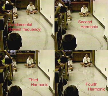 Standing Waves on SlinkyThe vibration of a slinky on the floor is an excellent way to show standing waves. The single loop pattern of the fundamental can usually be produced quickly. As you speed up the vibration to try to produce the second harmonic, it feels strange - you are feeling the tendency of the traveling waves to interfere destructively. The third and fourth harmonics can be produced with effort, but in between the resonances the motion is disorganized and awkward. The constructive interference which produces the standing wave depends upon the phase reversal upon reflection, which can also be demonstrated with the slinky. ![]() Experimenters are Kelly Jewett (right), Lisa White and Kim Wimpey. |