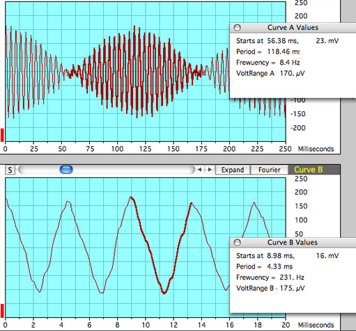 When the two tones are close together in frequency, the ear hears what seems to be a single pitch, and the measurement above gives a frequence of 231 Hz. But the tone pulses in loudness at the beat frequency, the difference between the two frequencies. Measuring the period of the pulsing gives a beat frequency of about 8Hz. We don't get an accurate frequency of either tone, but we know that the two tones center about 231 Hz and that they are 8 Hz apart in frequency.